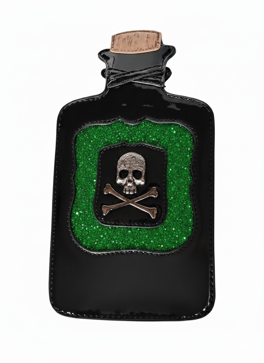 Bottled danger, straight from the apothecary’s darkest shelf. This toxic showpiece is shaped like a sinister poison vial, complete with a faux cork stopper and shimmering green glitter label stamped with a skull and crossbones. Equal parts wicked and stylish, it’s the perfect blend of cursed relic and killer accessory.